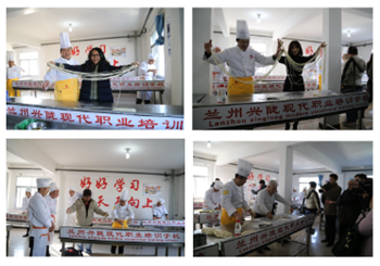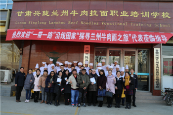 “兴陇——振兴陇原经济,打造一带一路兰州牛肉拉面经济带”,甘肃兴陇兰州牛肉拉面职业培训学校是一所集兰州牛肉面人才培训、产品研发、标准化经营、创业加盟扶持为一体的综合培训学校,经过10多年的发展,学校已经形成了“兴陇”连锁培训体系,目前旗下有兰州兴陇现代职业培训学校、河南登封兴陇现代职业培学学校、崇信兴陇职业培训学校、平凉兴陇现代职业培训校等,宁夏、东北、山东、澳大利亚分校正在筹备中,目前已面向国内外培养拉面人才三万多名,学员遍布世界各地。在甘肃兴陇牛肉拉面职业培训学校负责人的引导介绍下,“一面之缘——‘探寻兰州牛肉面之旅’”海外媒体采访团参观了学校教学模式,参观了学员学习状况,还有很多记者亲自体验了拉面技术,兴趣非常浓厚,并纷纷同学员、老师合影。