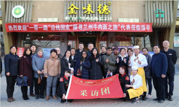 “一面之缘——‘探寻兰州牛肉面之旅’”海外媒体采访团记者与师生合影留念 体验完拉面后,“一面之缘——‘探寻兰州牛肉面之旅’”海外媒体采访团记者又参观了金味德兰州牛肉拉面体验工坊。体验工坊内含兰州牛肉拉面众多文化。据体验工坊负责人介绍,金味德兰州牛肉垃面品牌已在欧盟、美国、日本、澳大利亚、新加坡等40多个国家注册商标,品牌价值市场估值3亿多,2016年已启动新三板上市项目,目前品牌已升级为金味德牦牛肉拉面,兰州牛肉拉面产业布局已初具规模,正在向国际化大跨步迈进。