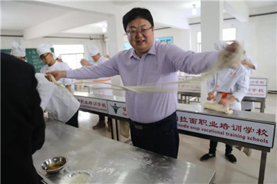 在甘肃兴陇兰州牛肉拉面职业培训学校学员培训基地察看了学员们的学习环境。同时元一智库董事总经理,元一智库连锁中心首席顾问铁丁还亲身体验了这指尖上的艺术——拉面。